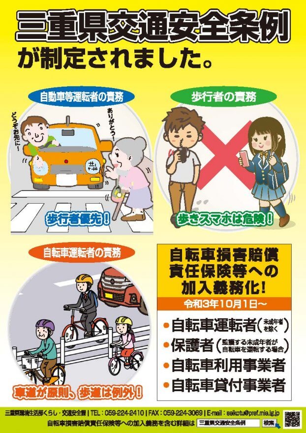 ご存知の方も多いと思いますが、10月1日より三重県交通安全条例(愛知県も)が制定されました。