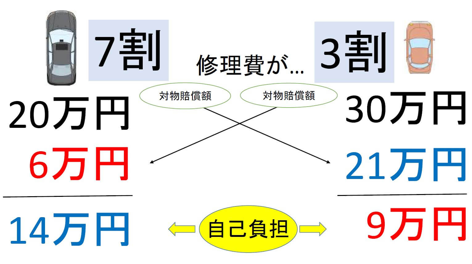 例えば、ある交通事故で、こちらの修理費が30万円、相手の修理費が20万円で、過失割合が、こちらが30%、相手が70%であった場合、相手から回収できる金額は、
